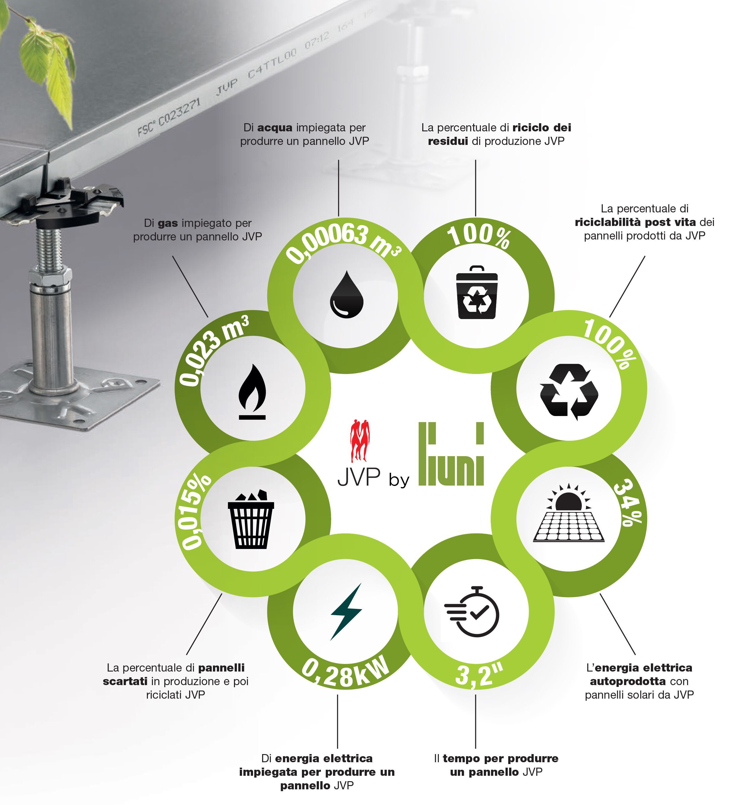 Per il pavimento sopraelevato “JVP 4x4”, GWP, EPD, FSC, INDOOR AIR COMFORT, CONTENUTO RICICLATO sono i cardini attorno a cui ruota la sua produzione, ottenendo anche la certificazione CRADLE TO CRADLE.