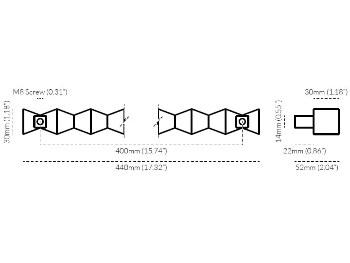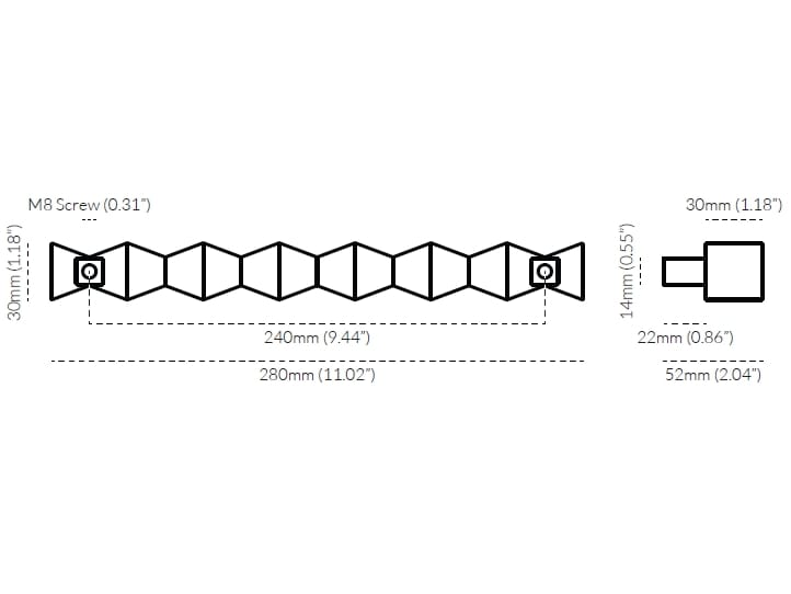 La maniglia Forma è disponibile in due misure: la piccola misura 280 mm di lunghezza (11,02") con un interasse di 240 mm (9,45"), mentre la grande misura 440 mm di lunghezza (17,32") con un interasse di 400 mm (15,75"). Tutte le misure hanno una sporgenza di 52 mm (2,05") e includono la ferramenta di montaggio. La collezione Forma include anche pomelli, maniglie per elettrodomestici e design per porte abbinati.