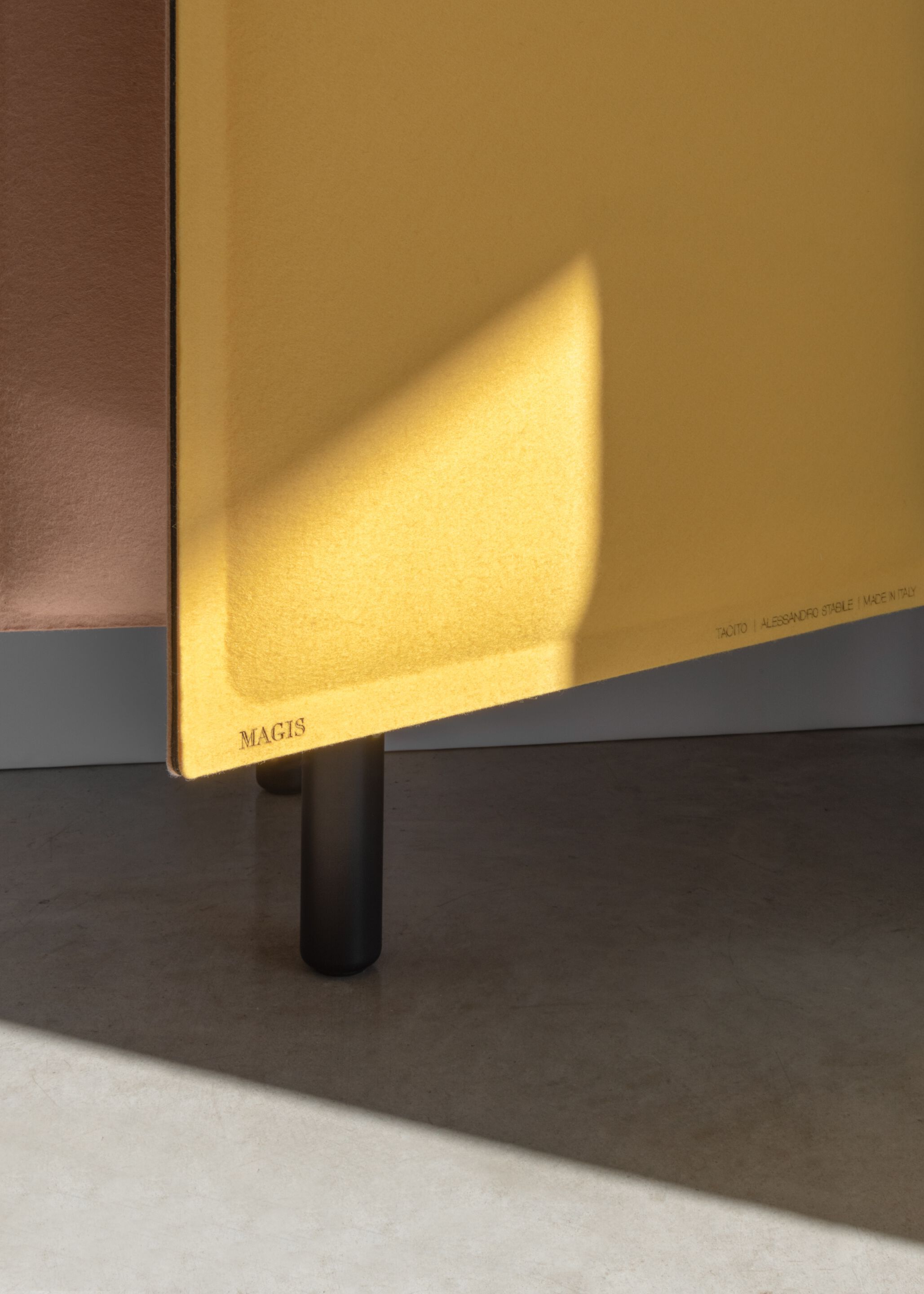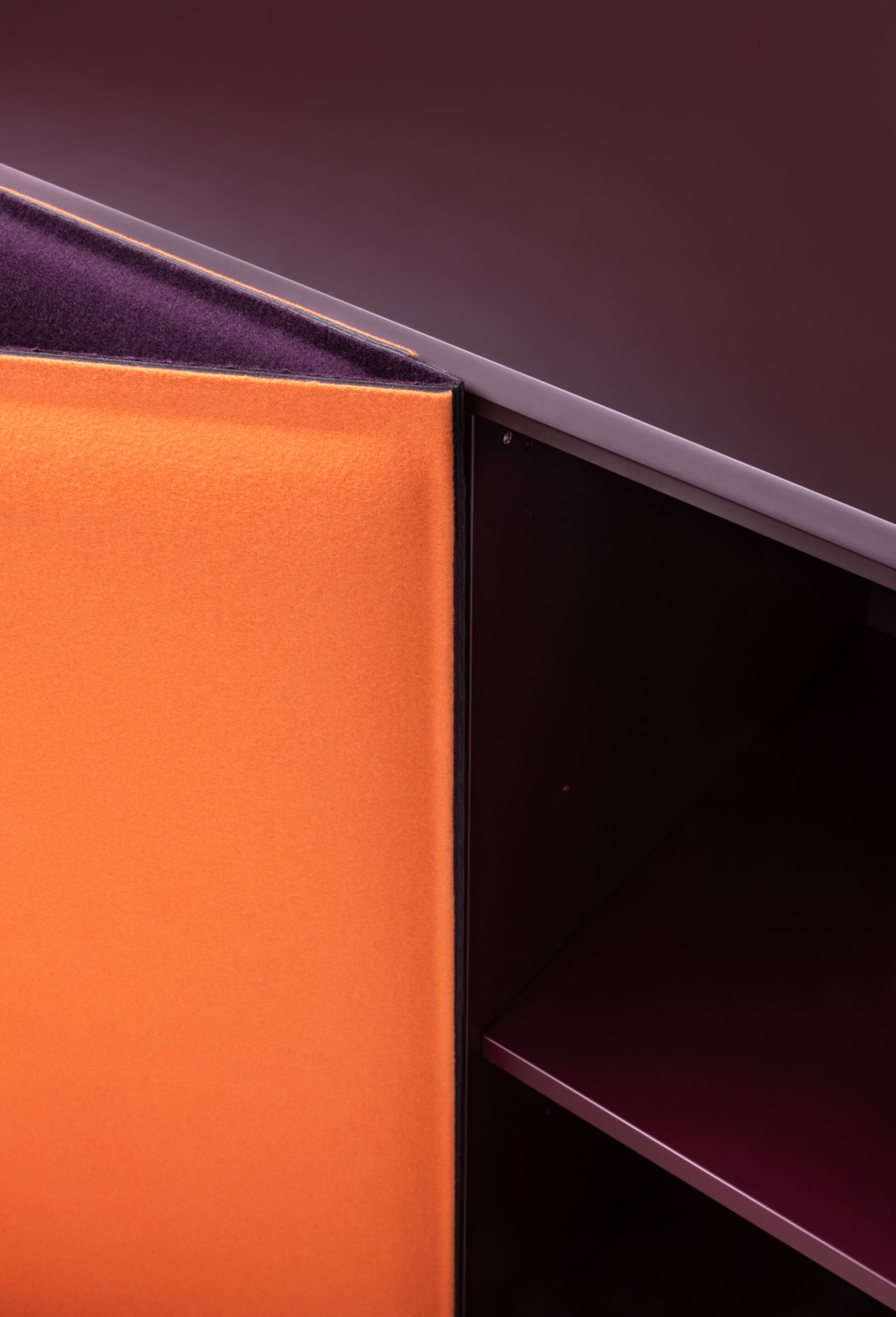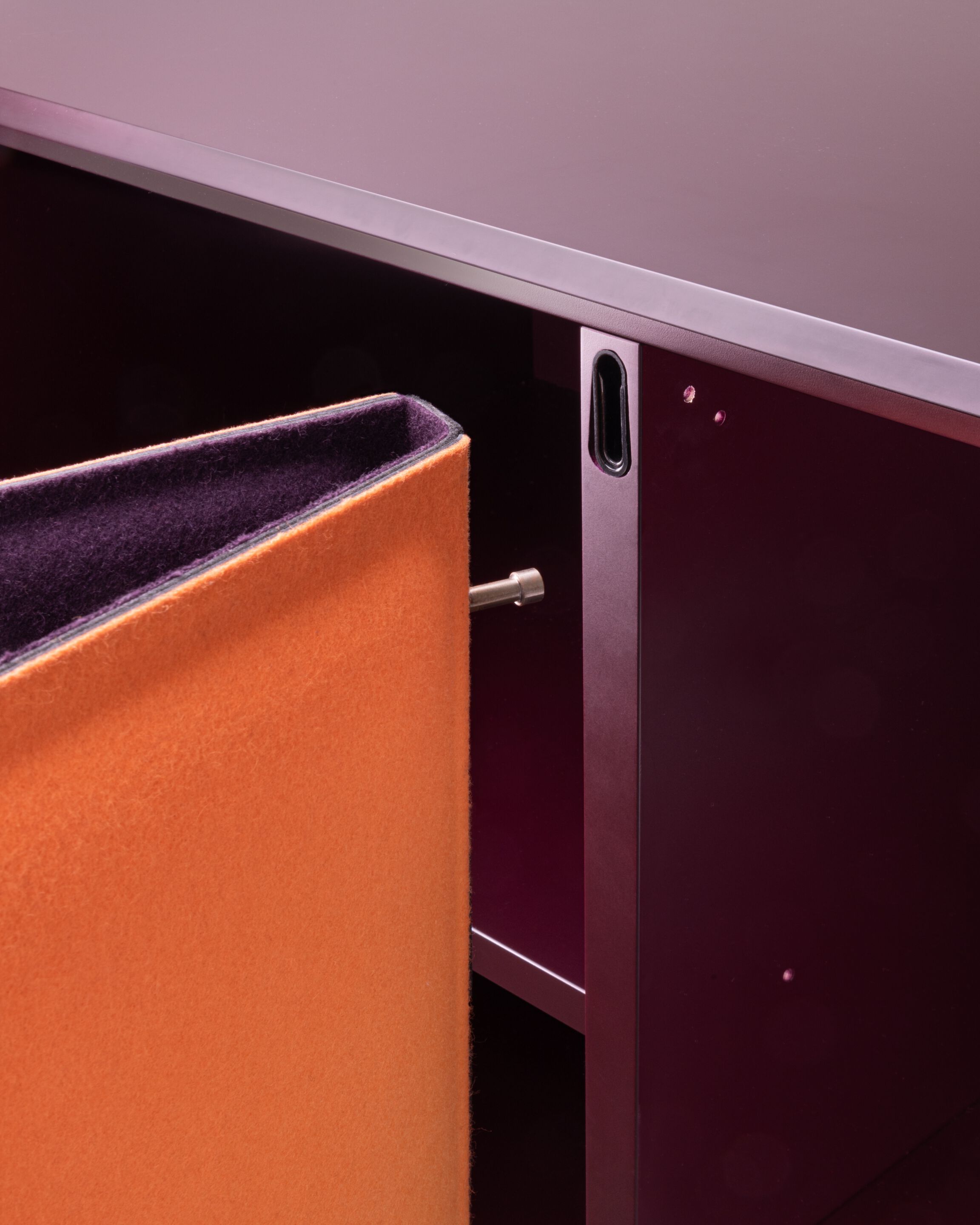 L’innovazione, infatti, è racchiusa indubbiamente nelle ante: realizzate in poliestere riciclato pressato con la stessa tecnologia utilizzata per i pannelli fonoassorbenti, vengono integralmente rivestite in tessuto, fronte e retro, durante il medesimo processo industriale. Il tessuto diventa così elemento estetico e tecnico allo stesso tempo, trasformandosi, appunto, in cerniera di raccordo.