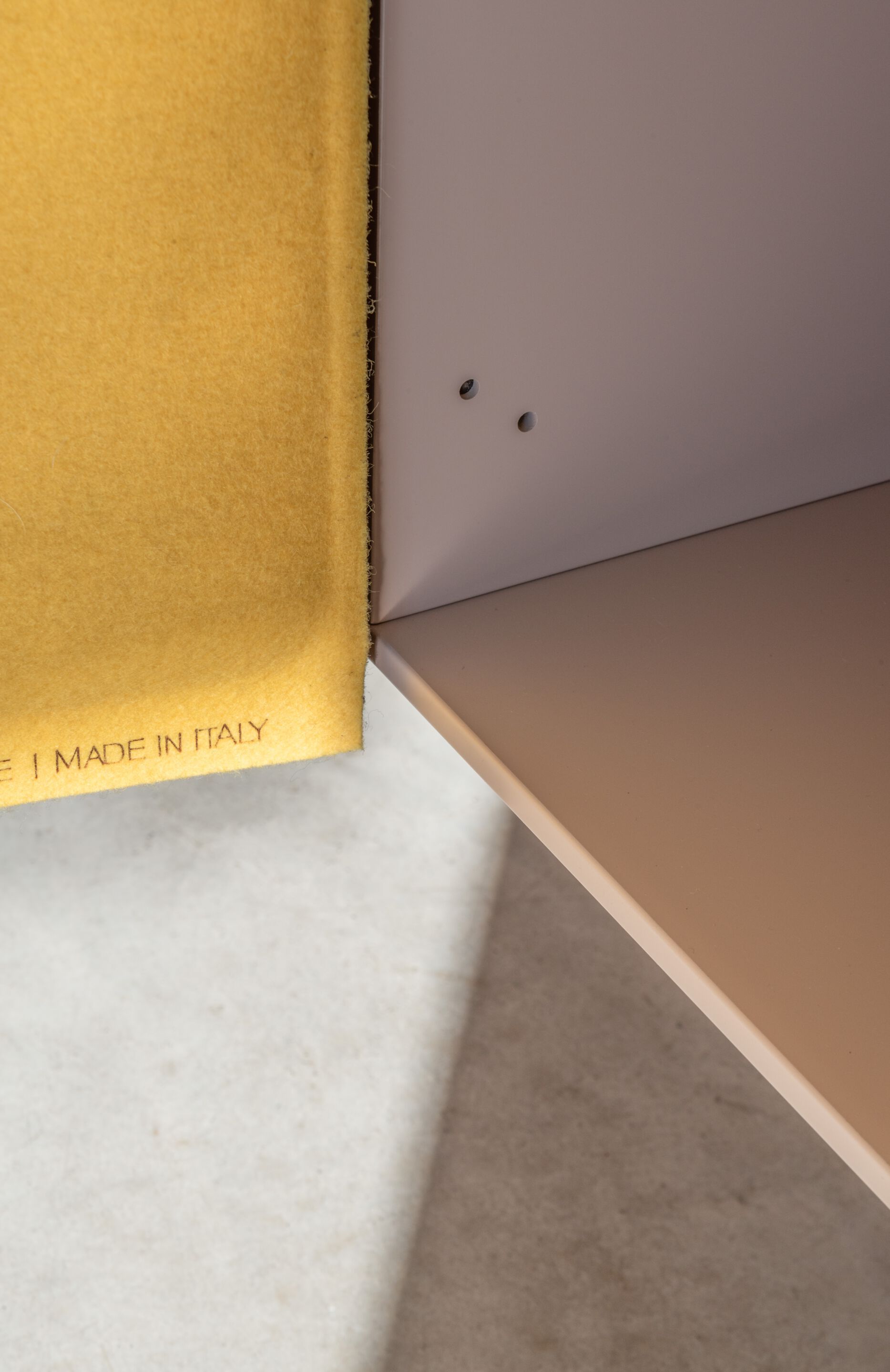 Materiali: struttura (fianchi, schiena e ripiani) in MDF verniciato, ante in feltro, gambe in alluminio anodizzato.