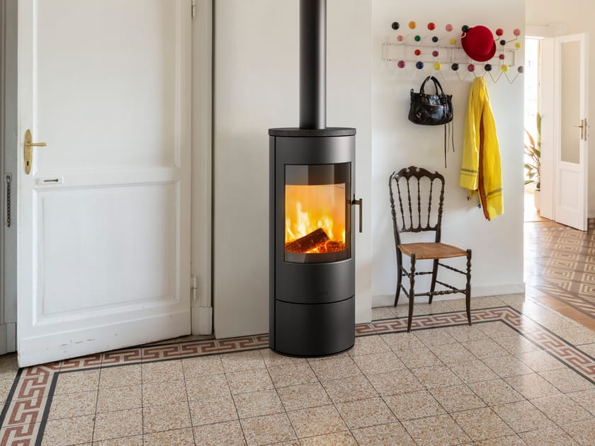 Rayha è una stufa a legna rotonda, con design elegante e minimal.