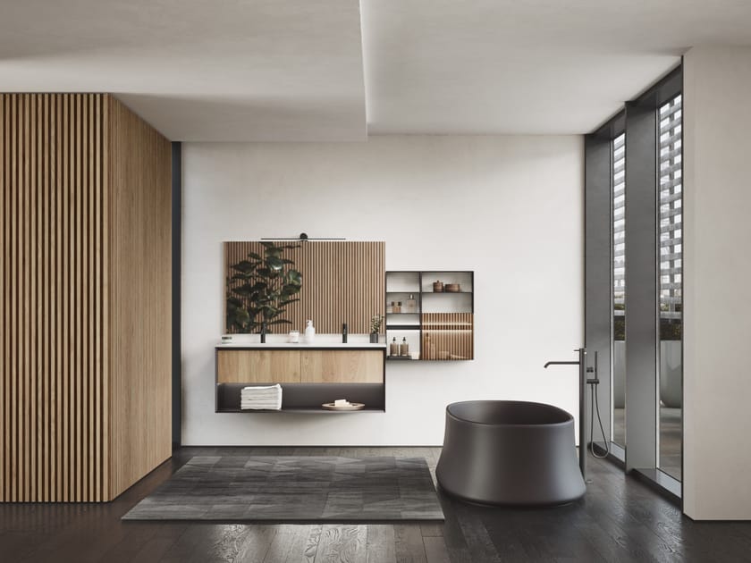 La collezione presenta un’ampia modularità per adattarsi ad ogni tipo di ambiente in stile contemporaneo, dal bagno di servizio ad una spaziosa “salle de bain”. Offre la possibilità di scegliere tra mobili con vano a giorno oppure completi di cassettone, posti a contrasto grazie a finiture in bicolore, proposte in 33 colori di laccature opache oppure in quattro essenze. La scocca a 45° ne definisce il design rigoroso nelle linee ma al contempo ricercato ed estremamente moderno.