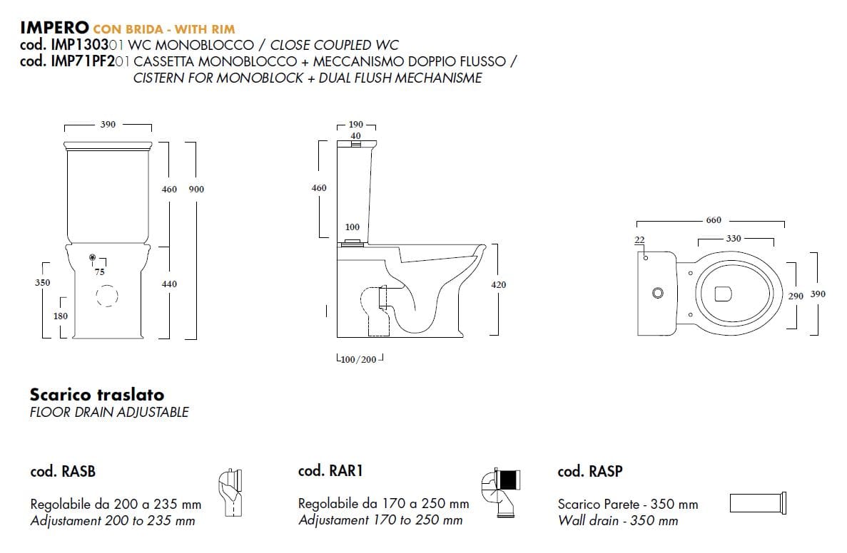 IMPERO è un vaso monoblocco con scarico unificato a suolo o a parete, kit di fissaggio incluso.