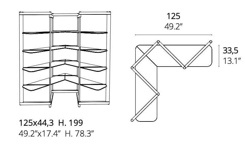 Panto è una libreria angolare autoportante con struttura in legno, montanti in metallo e mensole in cristallo. Ideale per essere posizionata a parete o come elemento divisorio in mezzo alla stanza.