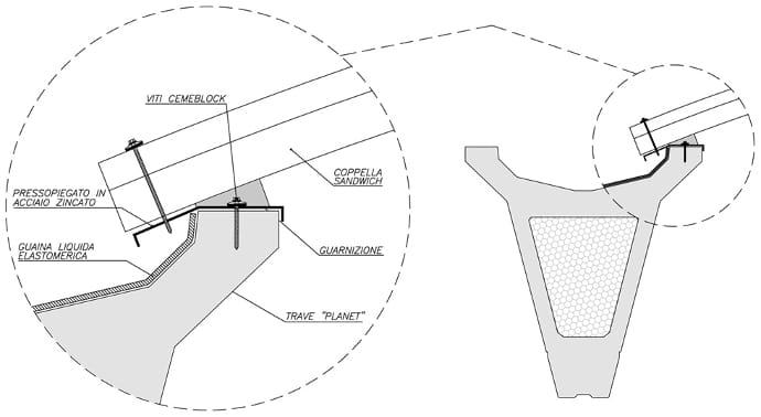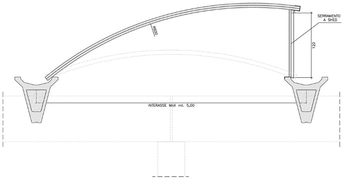 Il sistema di copertura a Sandwich è l’ideale per realizzare coperture leggere e ben coibentate, costituita da pannelli curvi (raggio 6 metri), pedonabili, composti con doppia lamiera d’acciaio zincato preverniciato (grecata quella esterna e micronervata quella interna) con interposta schiuma poliuretanica rigida autoestinguente (con densità 40 Kg/mc dello spessore minimo di mm 40). Il risultato è eccellente per leggerezza, isolamento termico ed acustico, reazione al fuoco, semplicità di montaggi tutti aspetti che si traducano in sensibili risparmi nell’economia generale del prefabbricato.