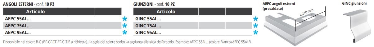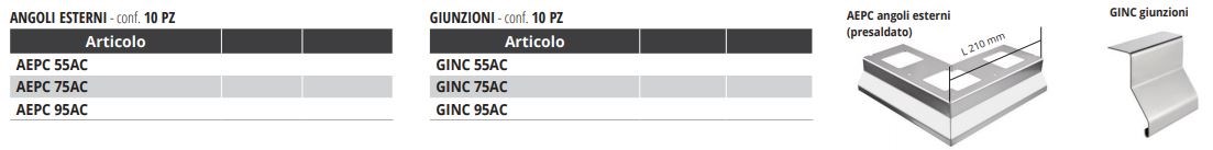 Disponibili in varie misure e altezze, in acciaio o in alluminio, vi sono anche i raccordi presaldati per angoli e spigoli esterni ed elementi di giunzione per unire i profili longitudinalmente.