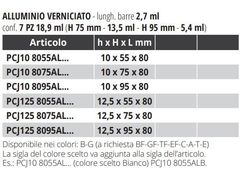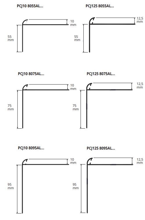 PROTERRACE PCJ in alluminio verniciato è una serie di profili perimetrali di finitura e protezione per i bordi frontali in cemento di terrazze e balconi. Il profilo è stato progettato con un raccordo di contenimento e di finitura della ceramica di 10 o 12,5 mm di altezza e un angolo di scolo che protegge il massetto. Posizionandolo al di sotto della membrana impermeabilizzante funge da gocciolatoio per l’acqua. Permette la posa a filo o staccata dal massetto a seconda che le piastrelle siano a filo o sporgenti dal massetto stesso. Disponibili in 3 misure con base tranciata standard (Largh. 80 mm) nelle altezze di 55, 75 e 95 mm, nelle versioni con il raccordo da 10 o 12,5 mm. Disponibili anche i raccordi presaldati per angoli e spigoli esterni ed elementi di giunzione per unire i profili longitudinalmente.