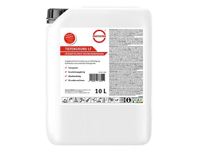 Protektor Tiefengrund è un primer speciale incolore e non pigmentato con elevato potere penetrante. Il prodotto è a emissioni ridotte e privo di solventi, permeabile al vapore, altamente resistente agli alcali, idrofobizzante e pronto all'uso.