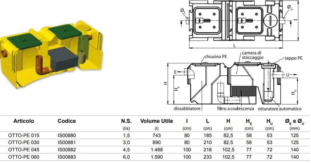 OTTO-PE è un separatore di olii ed idrocarburi prefabbricato in polietilene costituito da due moduli distinti accoppiati in cui sono presenti il dissabbiatore, il filtro a coalescenza e l’otturatore automatico. e' da utilizzarsi prevalentemente al servizio di scarichi pluviali, di piazzali e di officine meccaniche. I deoliatori vengono utilizzati come trattamento delle acque contenenti oli, provenienti per esempio da utenze civili, industriali o artigianali, come garage, piazzali, parcheggi, officine meccaniche, zone di lavaggio mezzi, ecc., prima del recapito in pubblica fognatura o a monte di un idoneo impianto di depurazione (filtrazione in pressione, chimico-fisico, ecc.). I dissabbiatori servono per separare le sabbie e gli inerti presenti nei reflui. La separazione degli oli è un processo fisico di rimozione di tutte le sostanze che hanno peso specifico inferiore a quello dell’acqua. La separazione di sabbie e inerti è anch’esso un processo fisico, ma di rimozione di tutte le sostanze che hanno peso specifico superiore a quello dell’acqua. I deoliatori sono vasche di calma dotate di un comparto interno, in cui si dà modo agli oli di flottare secondo meccanismi fisici di separazione liquido-liquido; le sostanze separate rimangono intrappolate nel comparto interno, mentre i reflui depurati passano nel bacino principale attraverso l’apposita apertura sul fondo del comparto interno stesso e raggiungono così l’uscita. I dissabbiatori sono vasche di calma in cui avviene la decantazione di sabbie e inerti che si depositano sul fondo. Questi manufatti possono essere abbinati a pre- e posttrattamenti che consentono di migliorare l’efficienza depurativa complessiva, in funzione del tipo di scarico e delle particolari caratteristiche del recapito finale. I deoliatori e separatori sono particolarmente adatti per piccole e medie comunità, in quanto offrono i seguenti vantaggi: