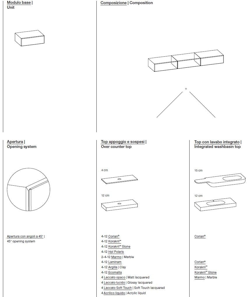 Materiale lavabi/Top integrati: Corian, Korakril, Shark, Marmo, Ceramica, Cocciopesto, Vetro