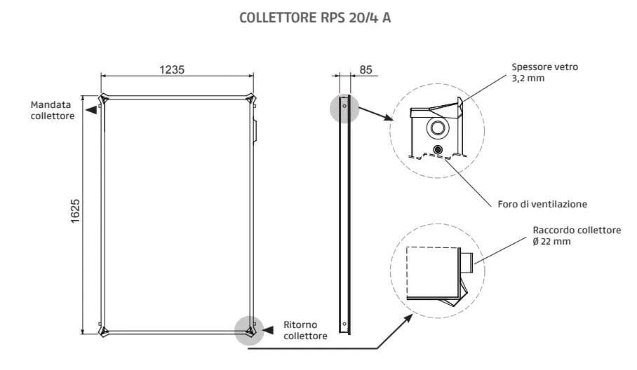 Il collettore solare RPS 20/4 A, installabile in posizione verticale, è dotato di un assorbitore in alluminio altamente selettivo con trattamento TiNOx e di una densa arpa in rame saldata a laser che permettono un assorbimento energetico dell'irraggiamento solare del 95%.