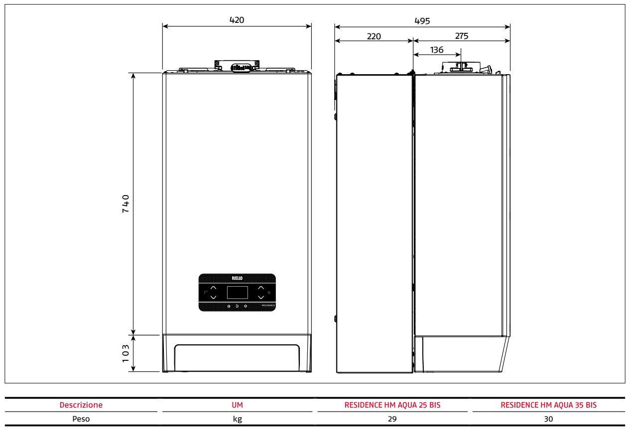 RESIDENCE HM AQUA è la caldaia a condensazione con accumulo bi-tank in acciaio inox da 30 litri, concepita da Riello all'insegna del risparmio energetico e dell'efficienza. RESIDENCE HM AQUA è costituita da un sistema composto da una caldaia combinata da 25 o 35kW e da un compatto accumulo sanitario bi-tank che si distingue per la semplicità di montaggio in due soli step: installazione dell'accumulo a parete e della caldaia su di esso. Lo scambiatore di calore primario, interamente realizzato in acciaio inox, unitamente allo scambiatore a piastre ottimizzato assicurano massima efficienza, affidabilità nel tempo e un elevato comfort. Le dimensioni compatte e l'intuitiva interfaccia utente completano il profilo di RESIDENCE HM AQUA.