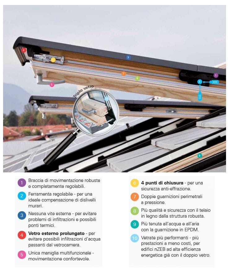Le finestre per tetti Roto sono 3 volte già isolate per evitare dispersioni termiche, ridurre consumi energetici, eliminare errori di posa ed offrire una protezione efficace da umidità e condensa in casa. Finestre premontate 3 volte già isolate con guarnizione scarico condensa per proteggere da muffa, umidità e infiltrazioni. Ingegneria e garanzia tedesca, profili in acciaio e chiusure centralizzate. Soluzioni moderne progettate per le case del domani.