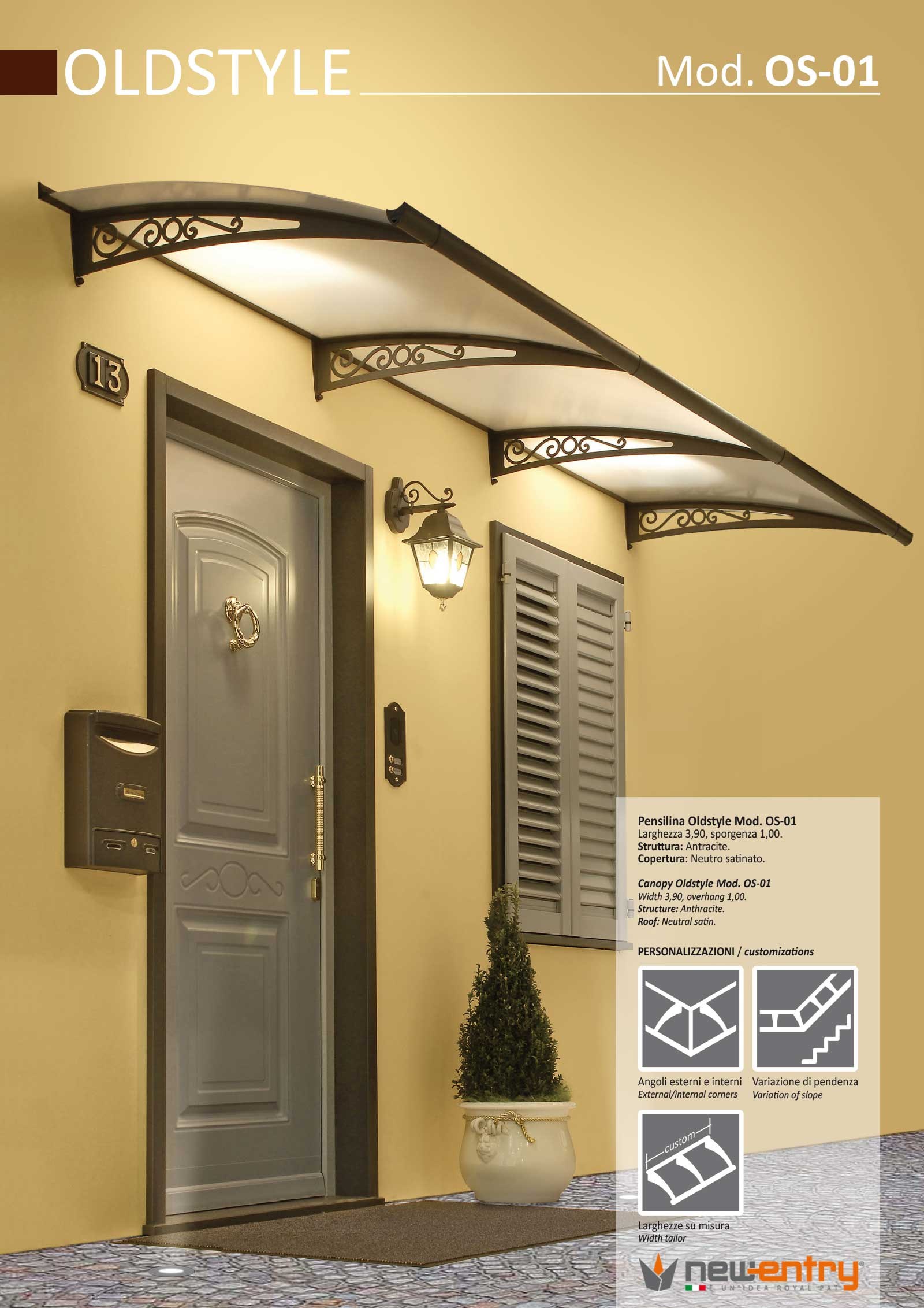 Newentry adotta un sistema modulare brevettato. Affiancando più moduli, l’uno dopo l’altro, si può raggiungere qualsiasi lunghezza, consentendo di allungare, accorciare,o spostare altrove la pensilina in qualsiasi momento. Inoltre, in caso di incidente o rottura accidentale sono sempre disponibili i pezzi di ricambio della pensilina.
