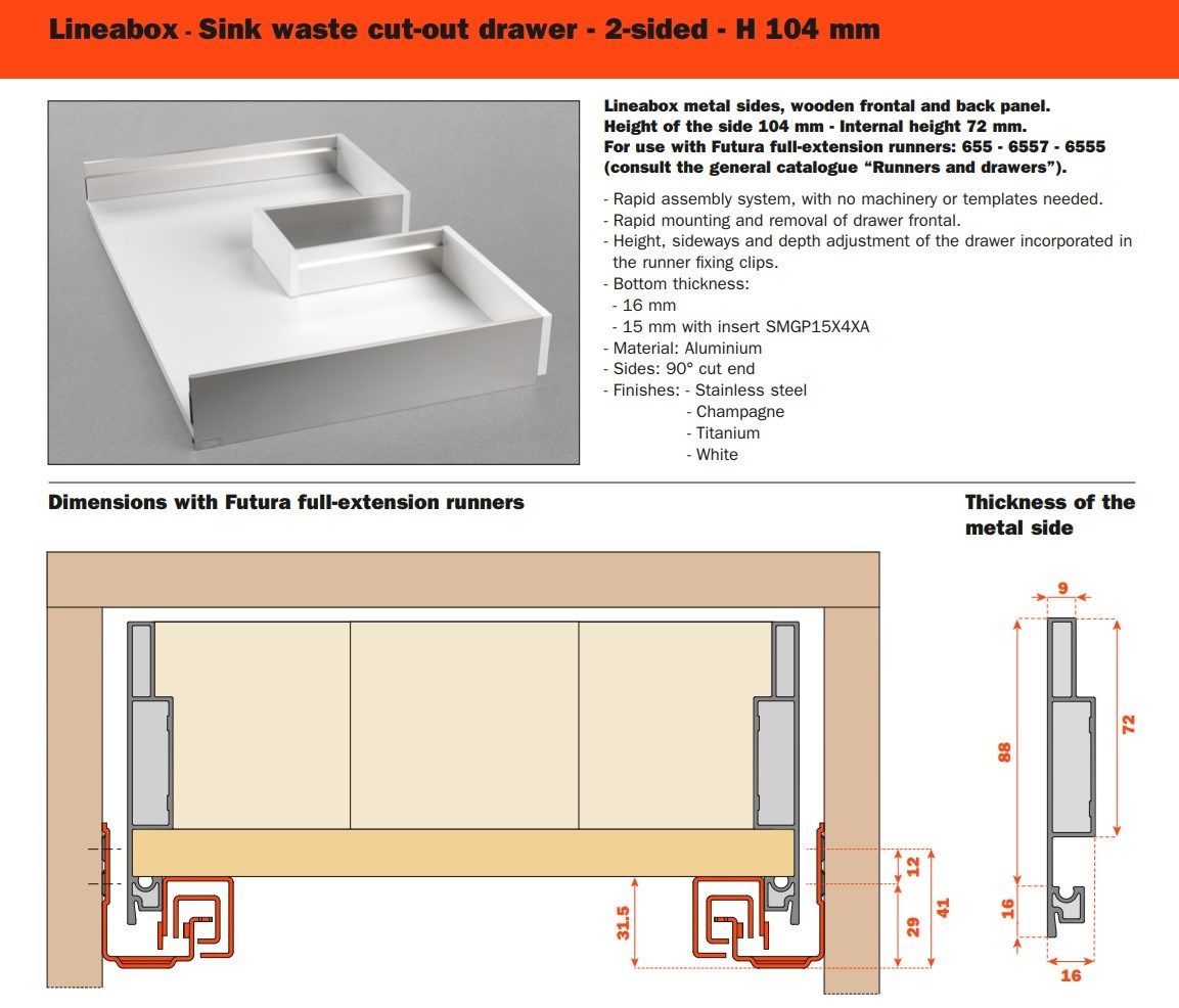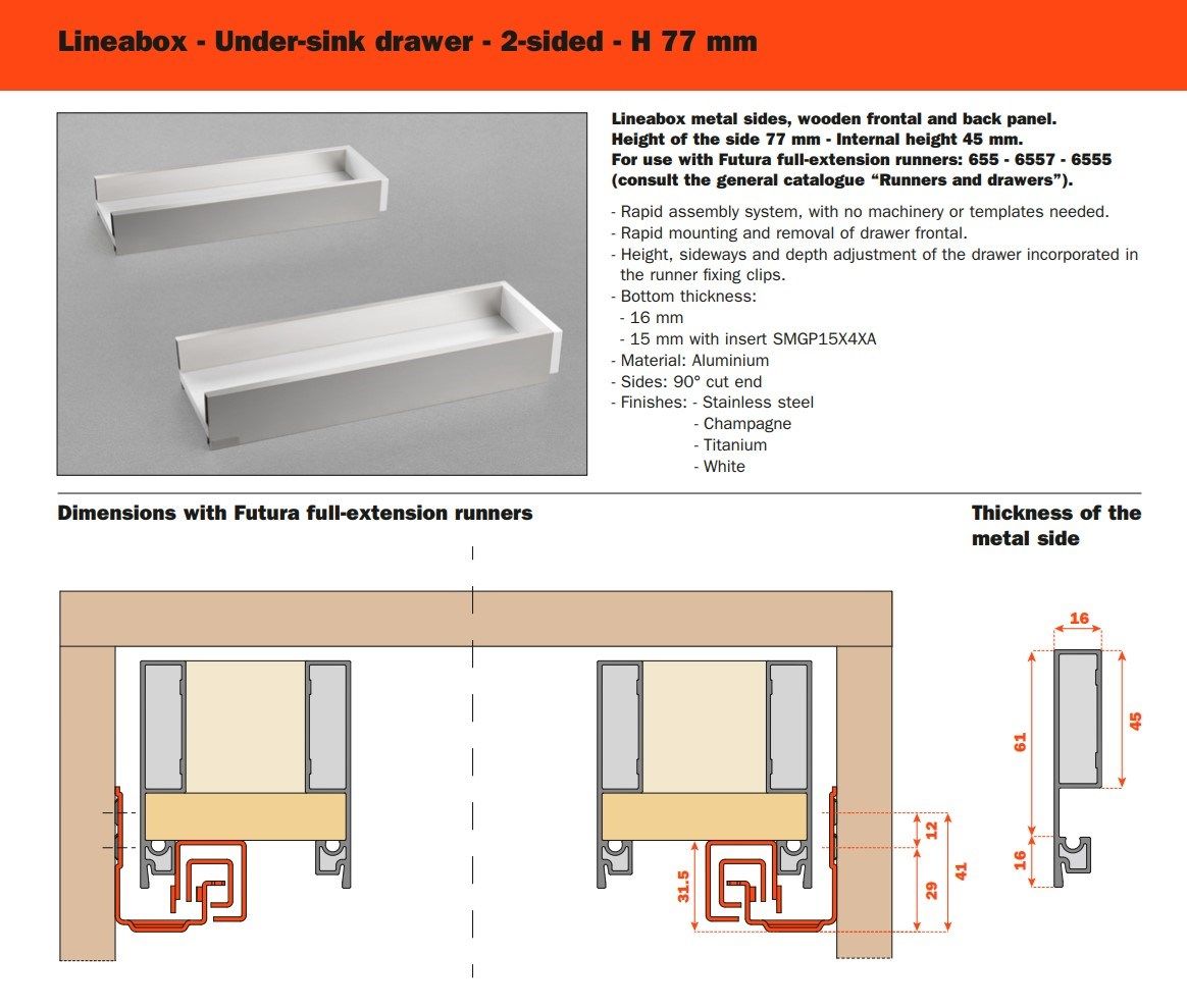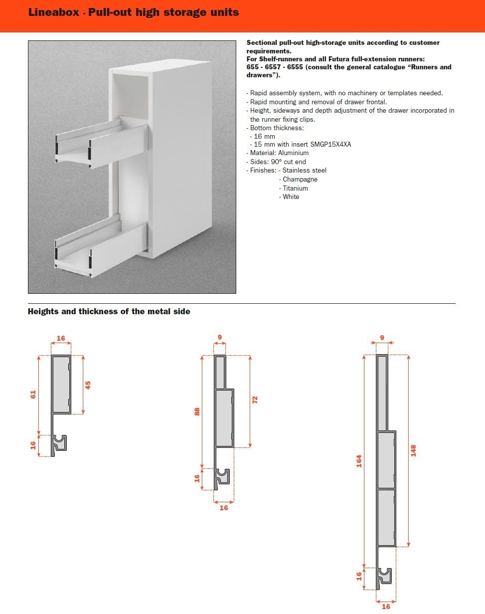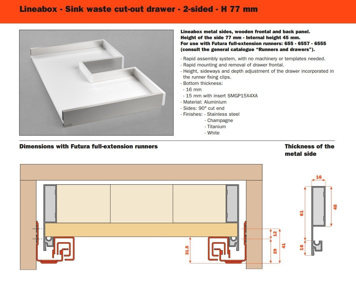 Tre differenti altezze, molteplici finiture disponibili, forme lineari e pulite: Lineabox ha un montaggio rapido e immediato. Totalmente privo di fori o elementi di fissaggio, è disponibile in tre altezze e nelle versioni 4 e 3 lati metallici e 2 lati con frontale e retro in legno. Lo spessore estremamente ridotto di soli 9 mm fa di lui uno dei cassetti più sottili sul mercato. Disponibile anche nelle versioni sottolavello, scarico sifone e all’interno di colonne estraibili.