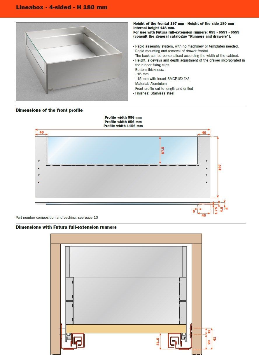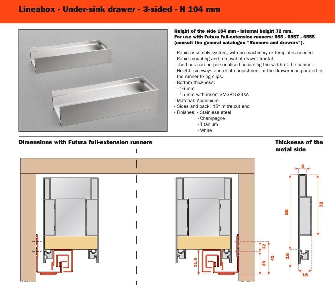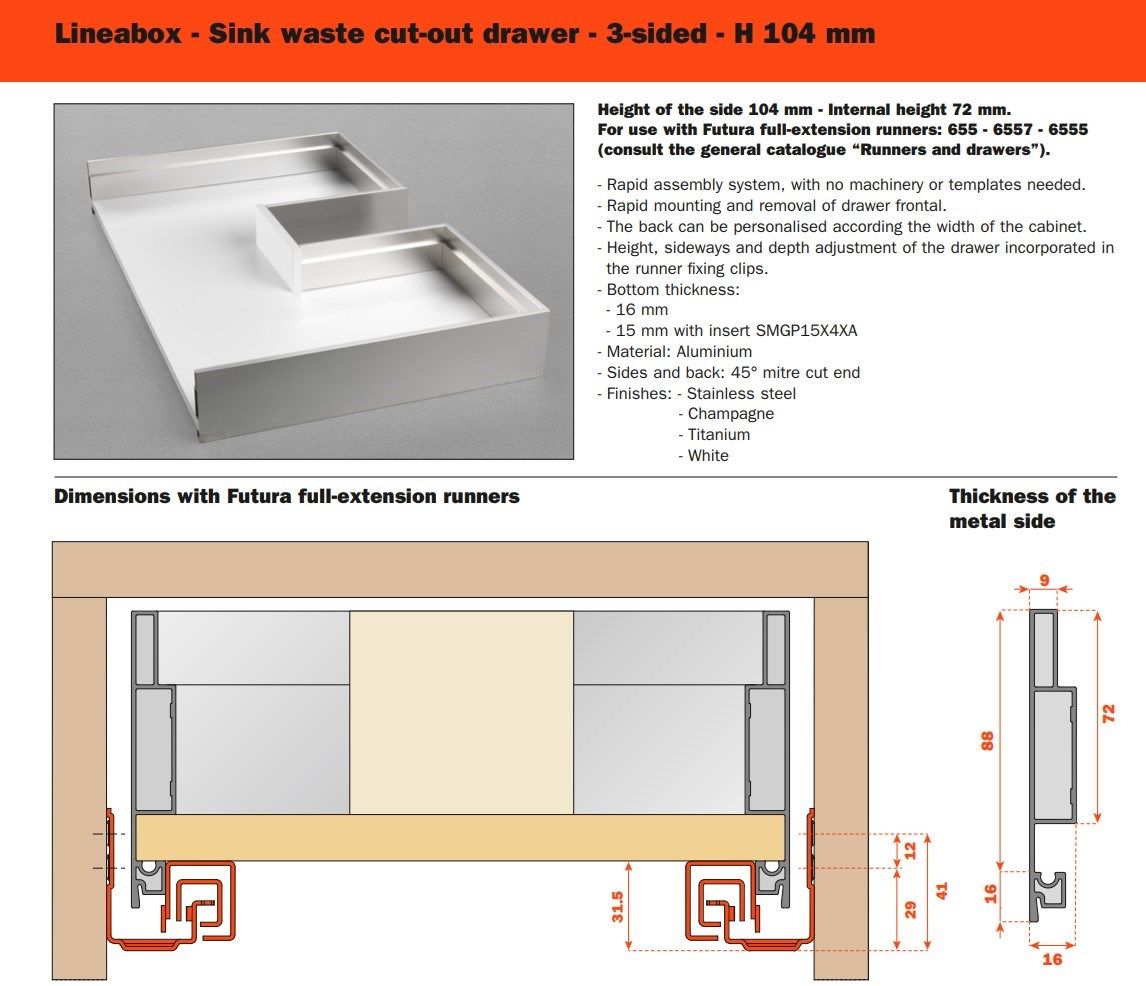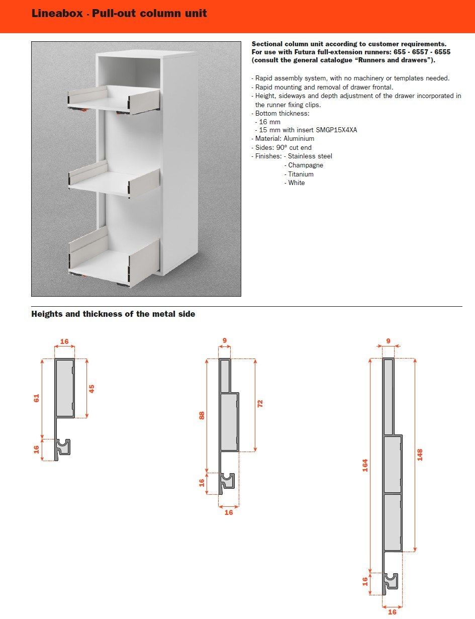 Tre differenti altezze, molteplici finiture disponibili, forme lineari e pulite: Lineabox ha un montaggio rapido e immediato. Totalmente privo di fori o elementi di fissaggio, è disponibile in tre altezze e nelle versioni 4 e 3 lati metallici e 2 lati con frontale e retro in legno. Lo spessore estremamente ridotto di soli 9 mm fa di lui uno dei cassetti più sottili sul mercato. Disponibile anche nelle versioni sottolavello, scarico sifone e all’interno di colonne estraibili.