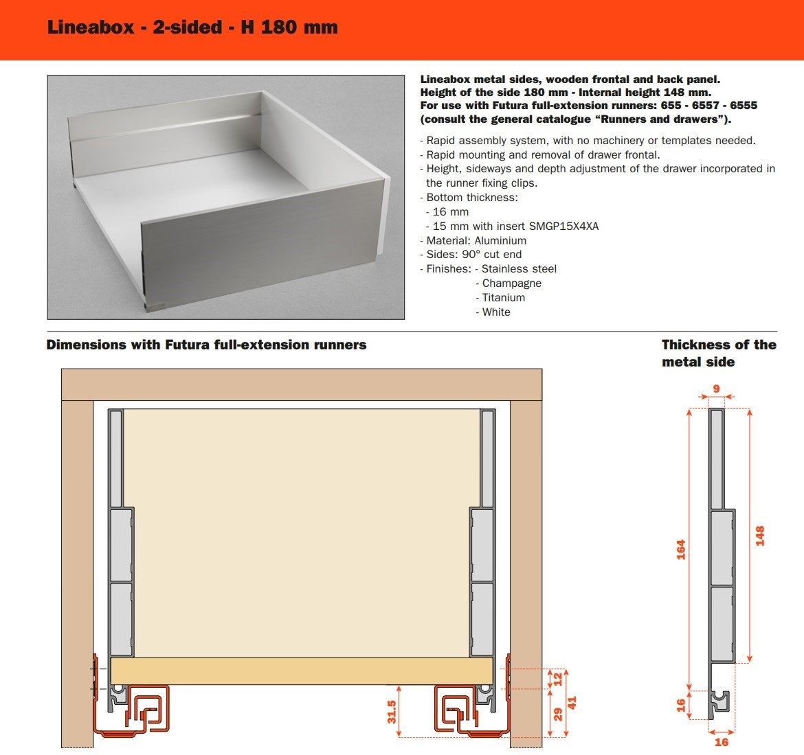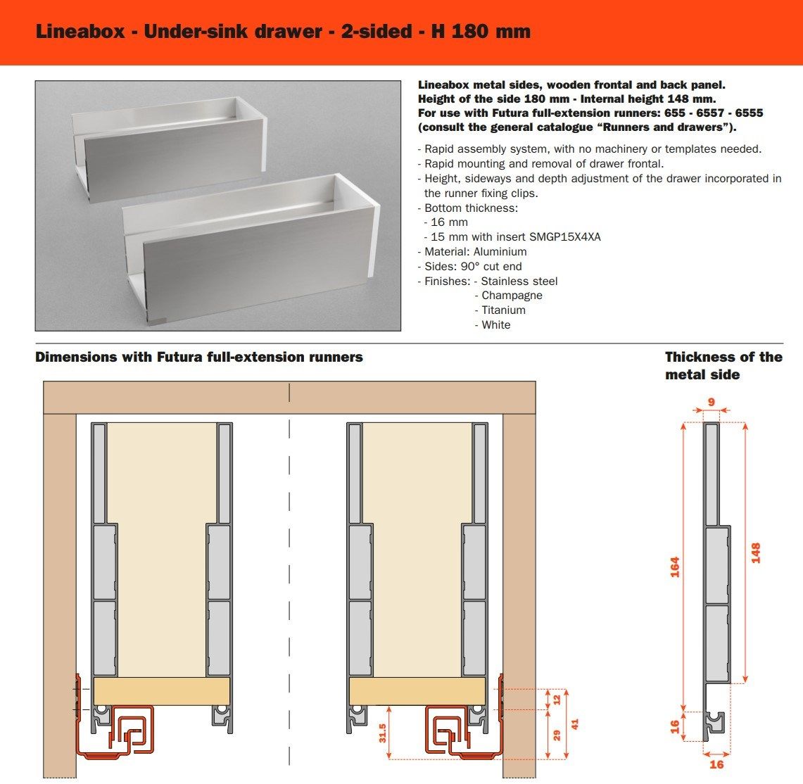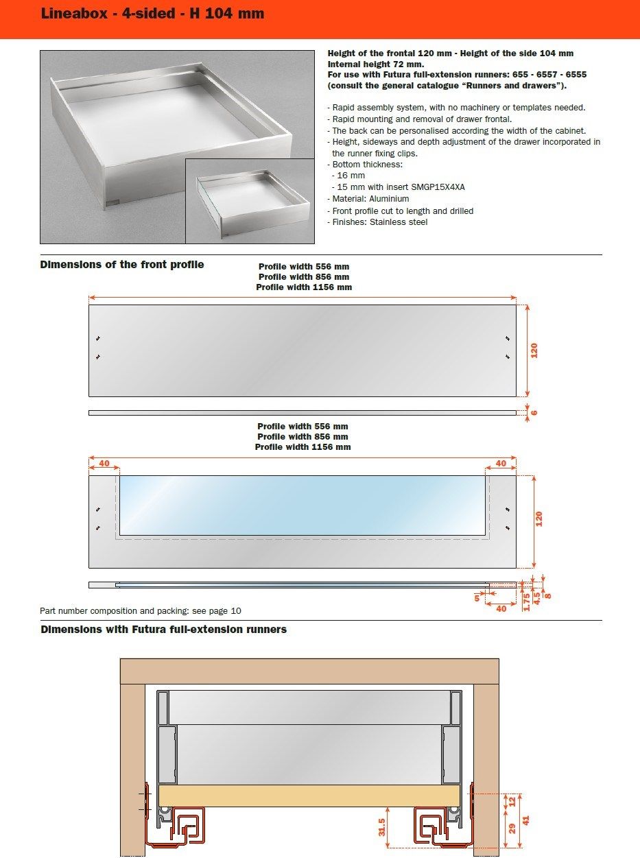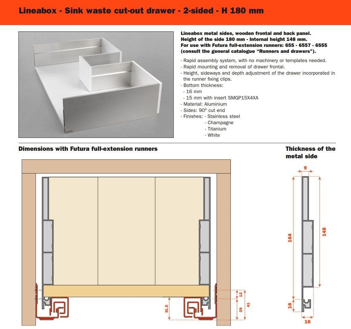 Tre differenti altezze, molteplici finiture disponibili, forme lineari e pulite: Lineabox ha un montaggio rapido e immediato. Totalmente privo di fori o elementi di fissaggio, è disponibile in tre altezze e nelle versioni 4 e 3 lati metallici e 2 lati con frontale e retro in legno. Lo spessore estremamente ridotto di soli 9 mm fa di lui uno dei cassetti più sottili sul mercato. Disponibile anche nelle versioni sottolavello, scarico sifone e all’interno di colonne estraibili.