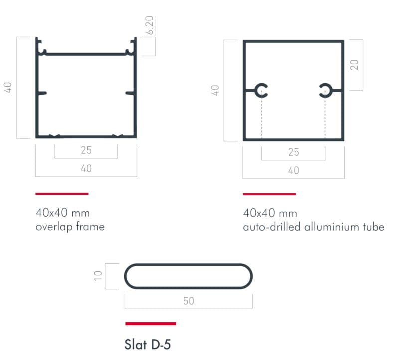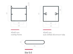 D-5 è una lama in alluminio estruso da installarsi su telaio meccanizzato. La sua installazione su telaio 40×40 permette di ottenere una perfetta tenuta nelle installazioni di telai di frangisole fissi in opera, mediante sovrapposizione. In questo modo, nasconderemo le possibili imperfezioni dell'edificio.