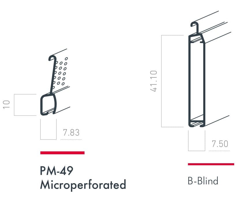 La PM-49 microforata è una nuova lamella in alluminio estruso che migliora notevolmente l'aerazione e l'ingresso della luce naturale. Un nuovo design con dimensioni che permettono di ottimizzare le dimensioni di cassonetto, asse e motore.