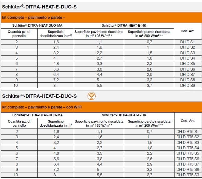 Schlüter-DITRA-HEAT-E-DUO-S sono kit completi per la realizzazione di sistemi di riscaldamento elettrico per pavimenti e pareti. I kit contengono le guaine di separazione Schlüter-DITRA-HEATDUO-MA (0,8 x 1 m), i cavi scaldanti Schlüter-DITRA-HEAT-E-HK ed il termostato touchscreen programmabile Schlüter-DITRA-HEAT-E-R oppure il termostato programmabile touchscreen WiFi Schlüter-DITRA-HEAT-E-R-WIFI.