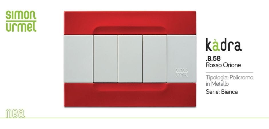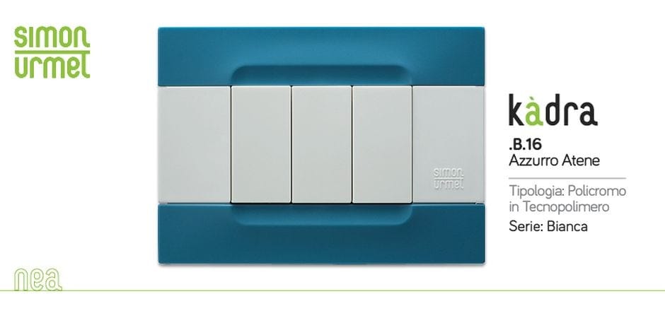 Kàdra è la serie di placche di design installabili nella serie civile NEA di Simon Urmet. Firmata dall’architetto Antonio Citterio in collaborazione con Toan Nguyen, questa placca dal design definito e regolare caratterizza e arreda gli spazi. Kàdra è disponibile in due versioni: monocròmo, in tecnopolimero, nata per esaltare la pura forma del design originale; e policromo, in tecnopolimero e metallo. Disponibile con numerose combinazioni di finitura e integrabile con tutte le funzioni di un moderno impianto elettrico.