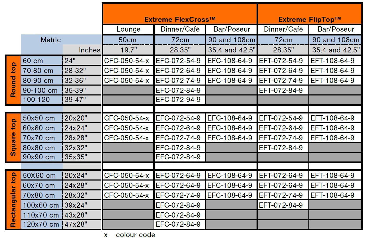 - StableTable® Extreme™ è disponibile in cinque misure di gambe, per adattarsi alla maggior parte dei tipi di locali e alle diverse dimensioni dei piani dei tavoli.