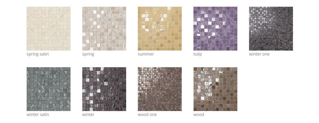 Gli smalti cangianti e gli elementi vetrosi dei mosaici Four Seasons impreziosiscono ogni superficie e ogni ambiente della casa, creando scenografici riflessi e giochi di luce. L'ampia gamma di tonalità cromatiche proposte, si abbinano a tutti i rivestimenti e ai pavimenti delle nostre collezioni, esaltando le superfici lucide e creando un gradevole contrasto con quelle satinate. La gamma colore è molto ampia e affianca ai colori neutri e naturali, colori più vivaci e decisi. E’ proposto con due diverse finiture di superficie (lucida e Satin) ed è fornito su rete assemblato su fogli di cm 30x30. Nel 2014, alla tradizionale tessera formato 2,3x2,3 cm, è stata affiancata la versione One con tessera ancora più preziosa di 1x1 cm. Four Seasons, essendo assemblato su rete e data la piccola dimensione della tessera, può essere utilizzato anche per rivestire superfici leggermente curve.