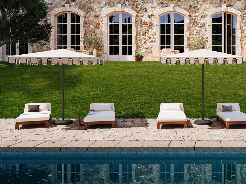 Un'efficace combinazione di struttura nero / Beige limestone e telo Canvas / Nectar / Castle, rifinita con volanti e con un “biais” nero. Questo ombrellone è una dichiarazione di bellezza classica, perfetta per chi desidera aggiungere un tocco drammatico e senza tempo al proprio spazio esterno. Disponibile quadrato o rotondo.