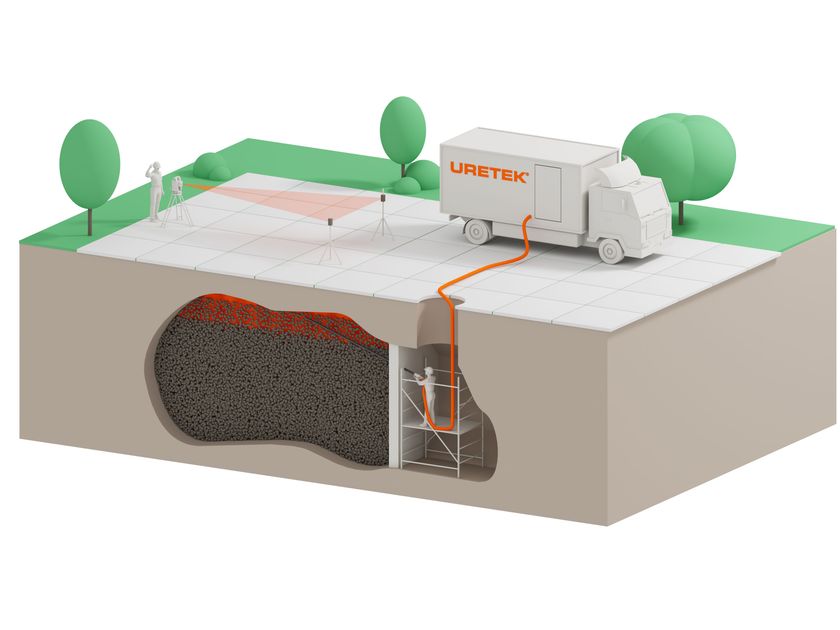 La resina espandente Uretek Geoplus® viene iniettata fino alla completa saturazione della cavità e al raggiungimento sulla volta della pressione di contrasto prevista da progetto.