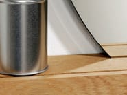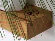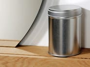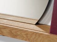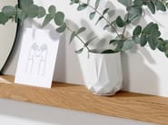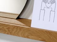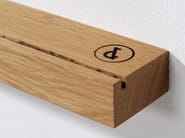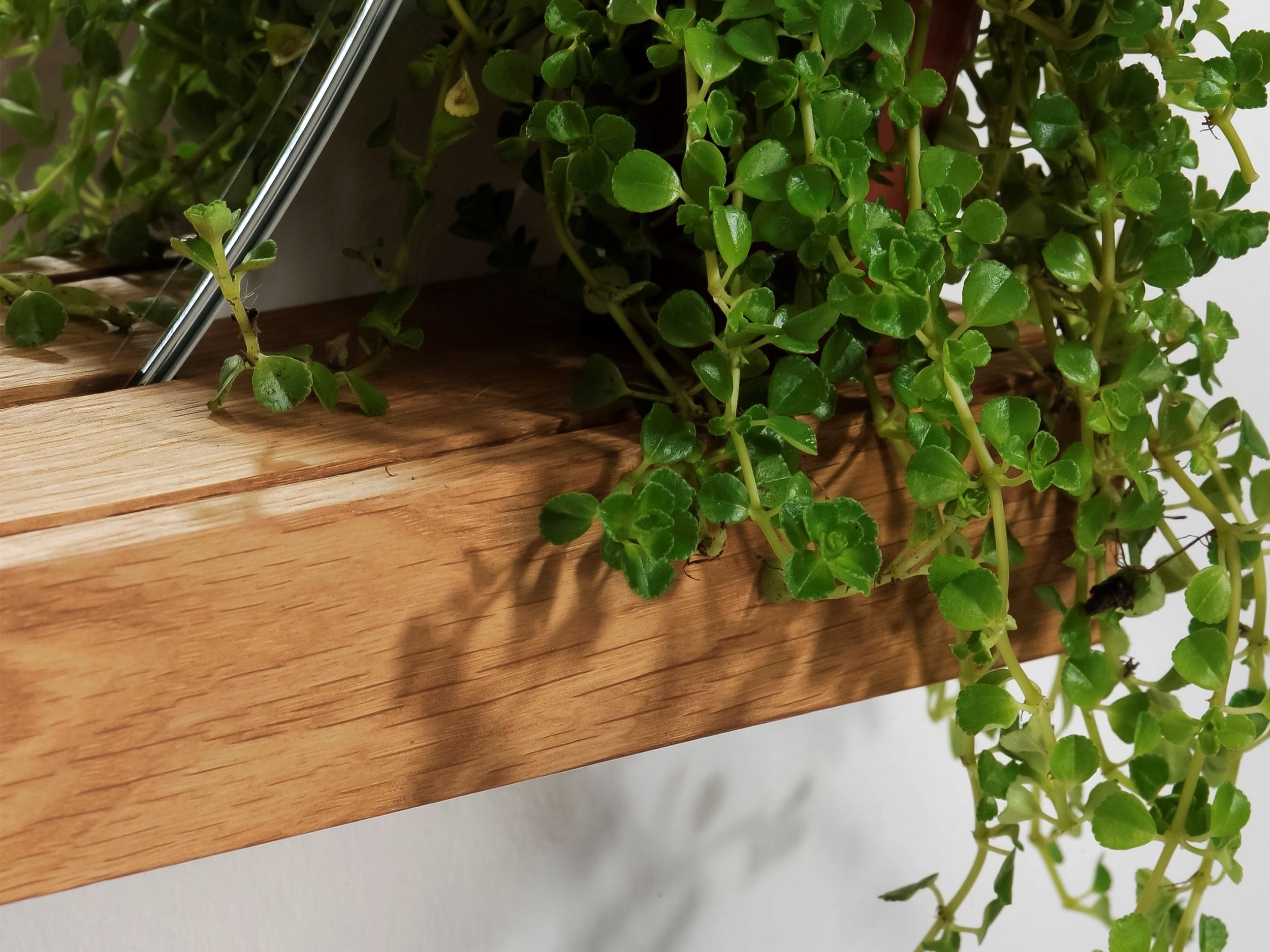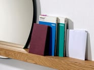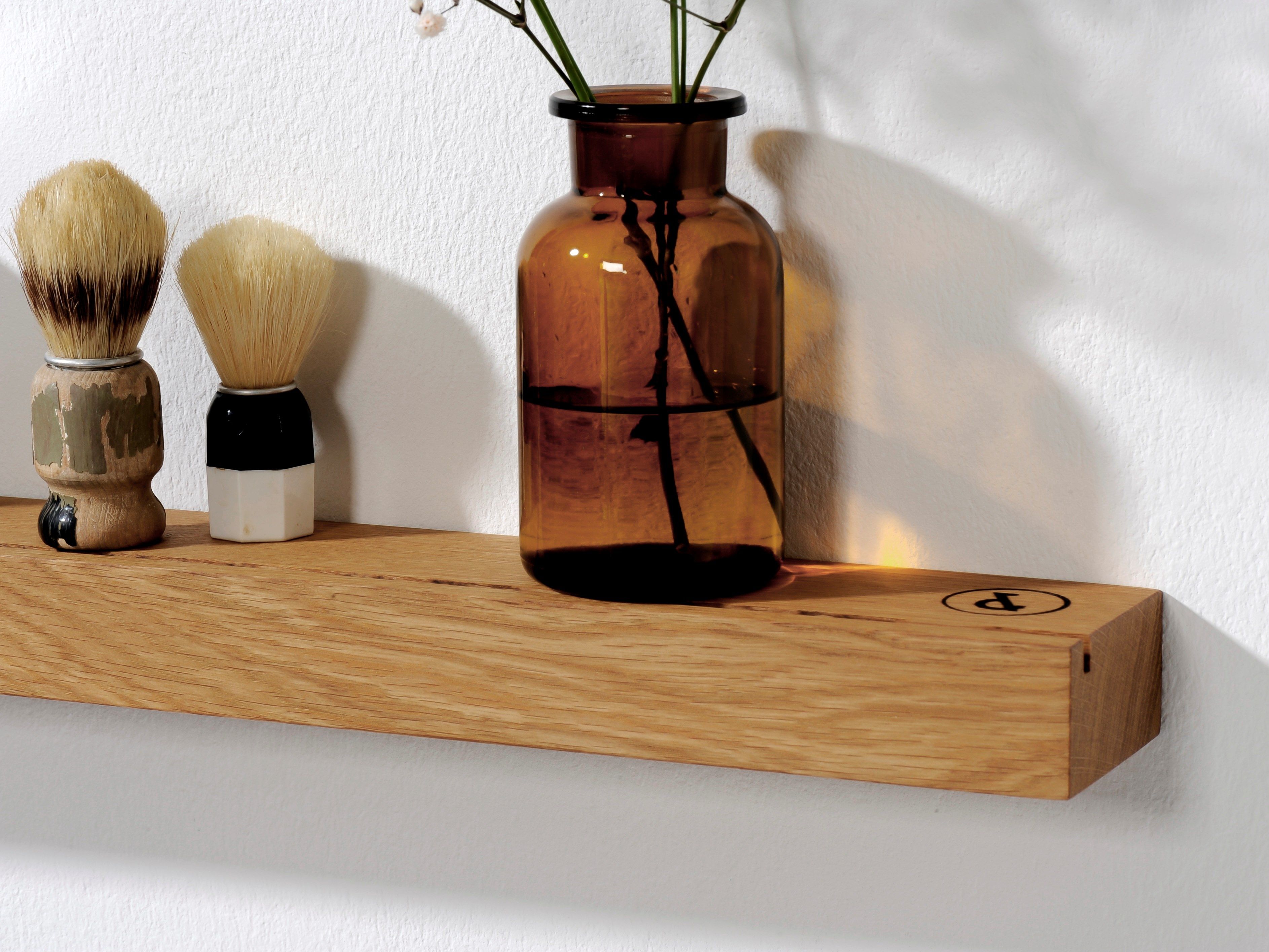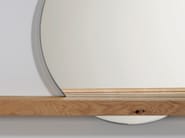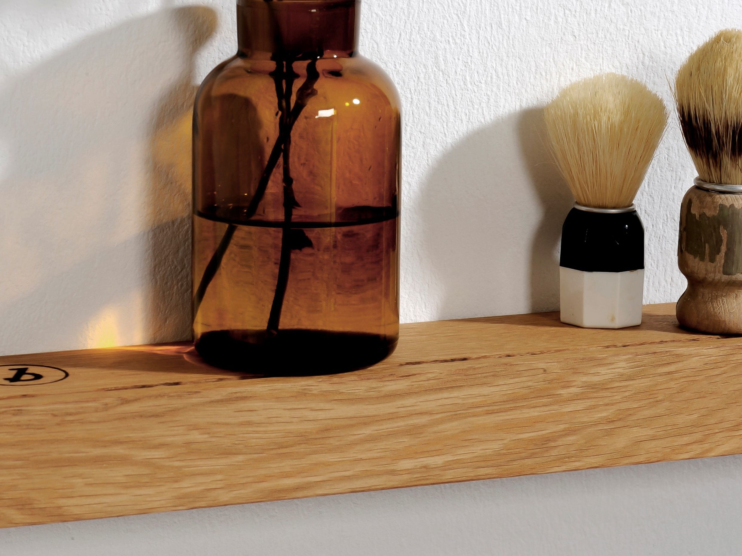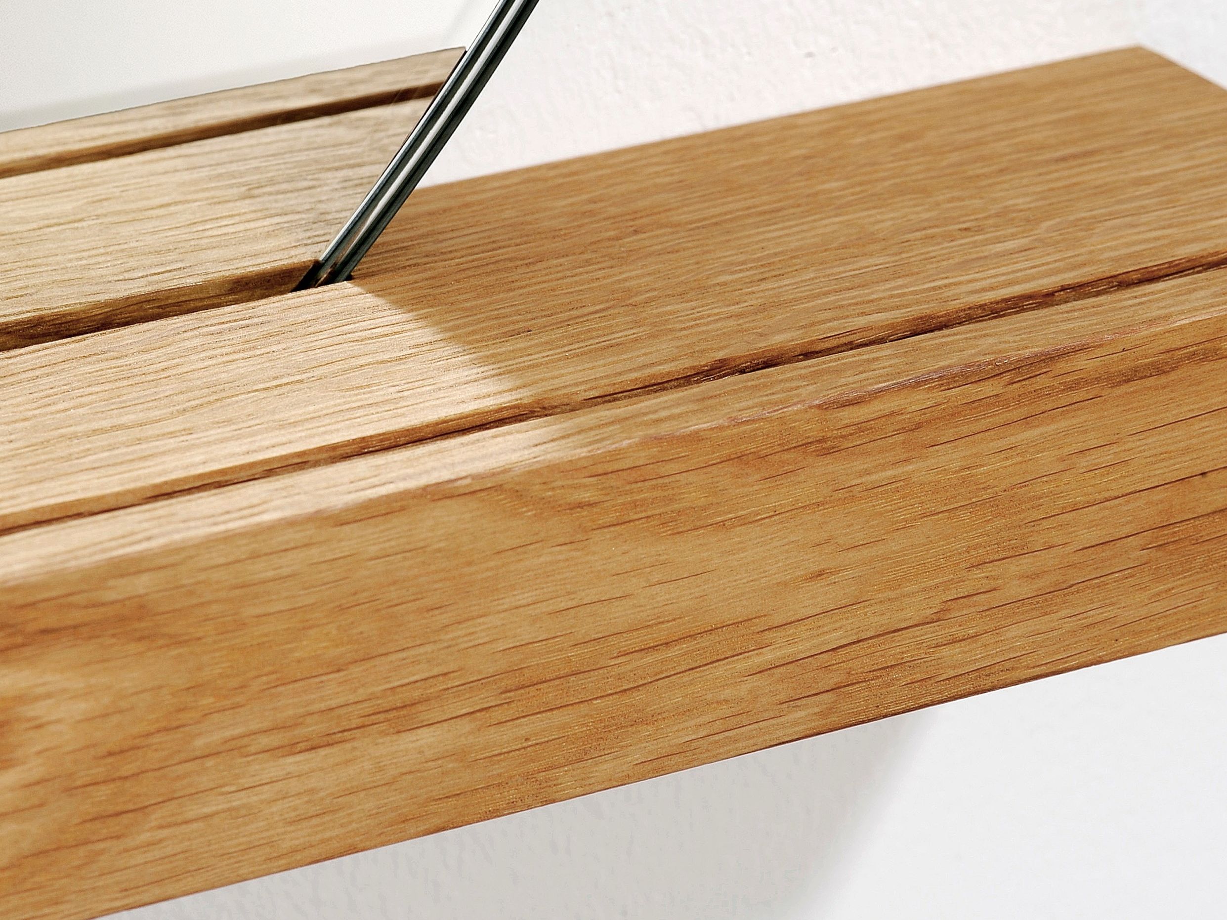 La mensola in legno di rovere è lunga 100 cm ed è fissata al muro tramite due viti. Lo specchio ha un diametro di 50 cm ed è inserito nell'apposita fessura.