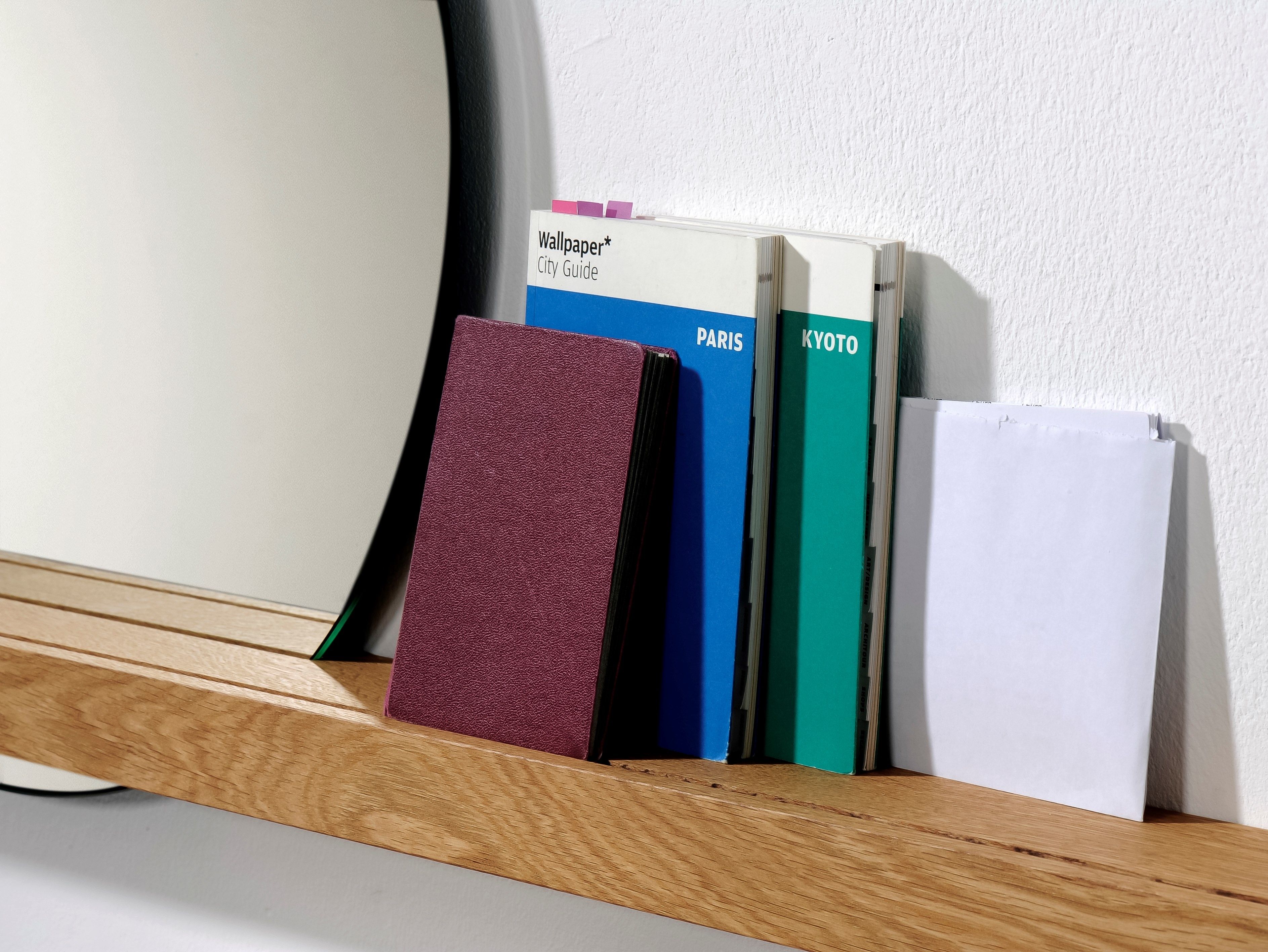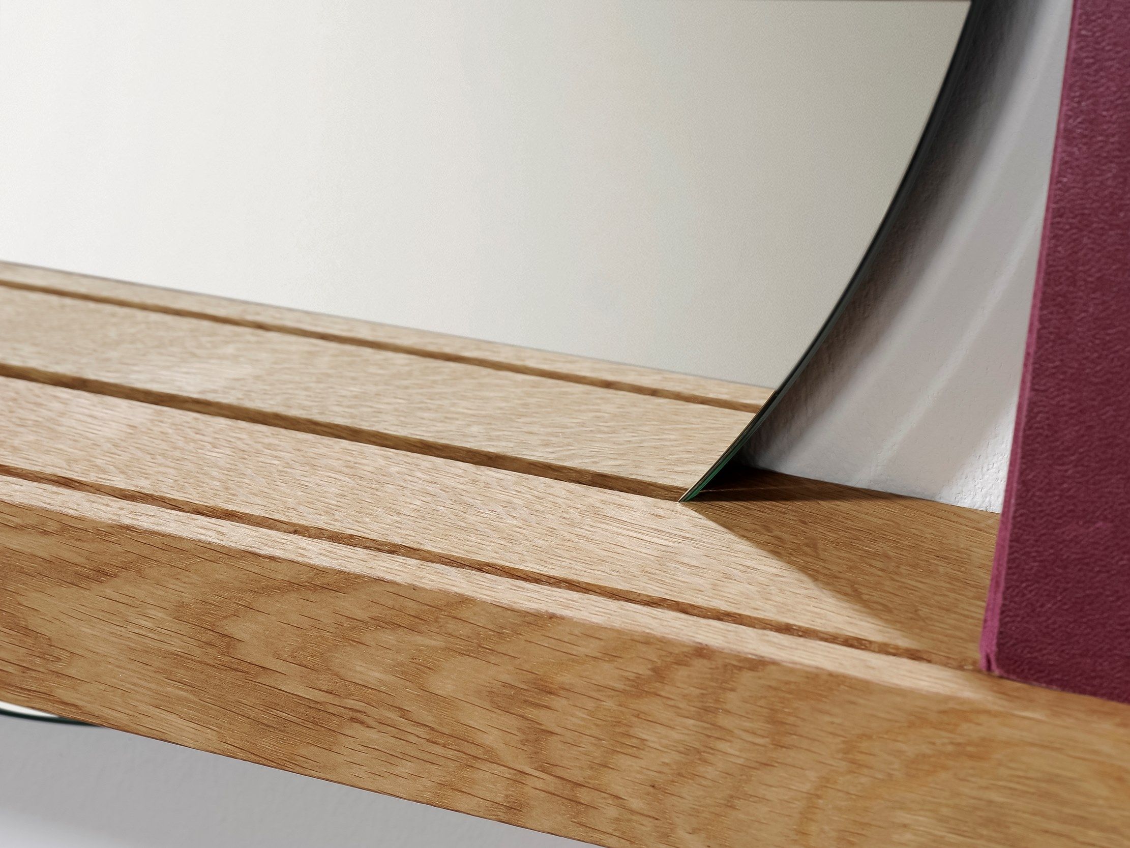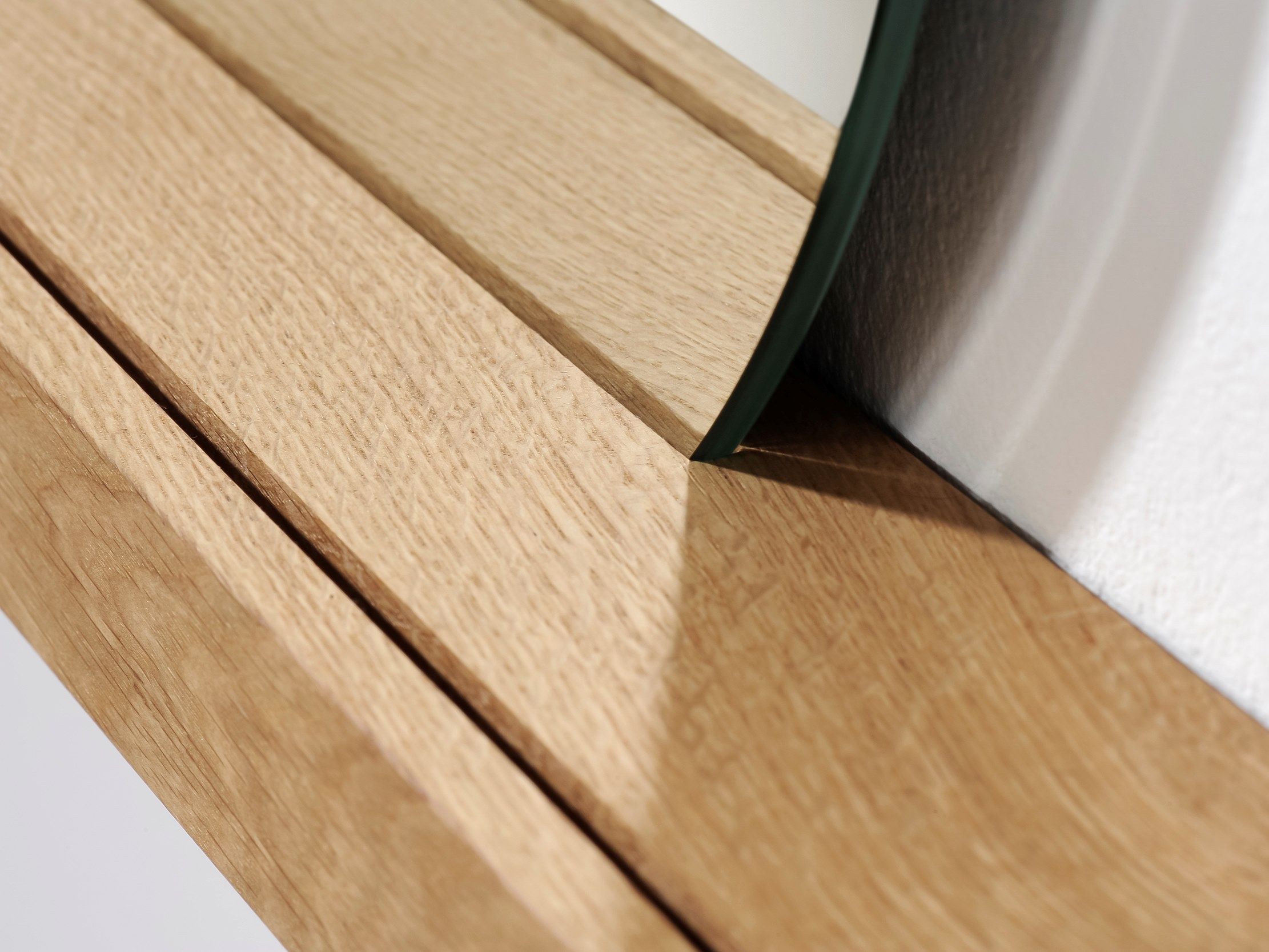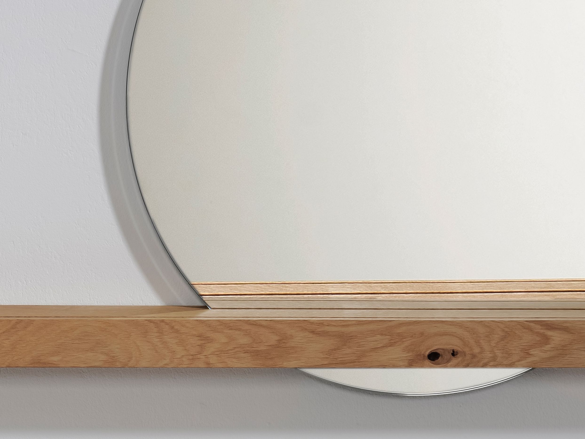 Lo specchio da parete Oak 01 di weld & co combina una sottile sporgenza di massello di rovere oliato con uno specchio rotondo che sembra quasi fluttuare. Questo effetto è reso possibile da una fessura nella mensola: lo specchio e l'apertura sono dimensionati in modo che lo specchio venga automaticamente tenuto in posizione una volta inserito, ottenendo un accattivante mix di forma e funzione.